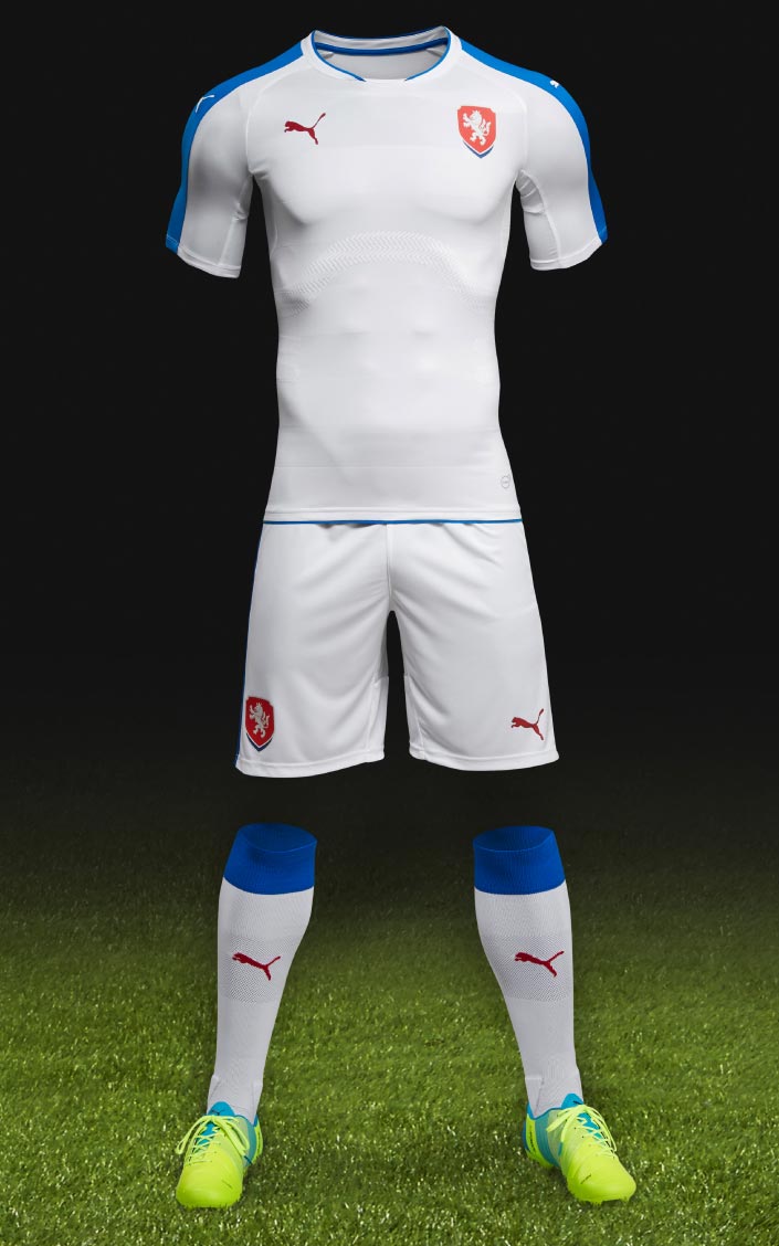Չեխիայի հավաքականի նոր հյուրընկալվող մարզաշապիկը ամբողջությամբ սպիտակ է՝ համադրված կապույտ գույնի հետ: